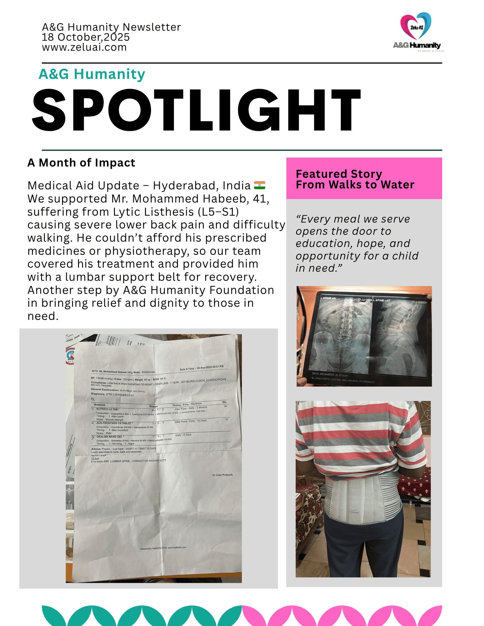 Due to financial hardship, he was unable to afford his prescribed medicines and physiotherapy treatment. Through A&G Humanity Foundation, we were able to provide the full cost of his medical care, including his medicines, lumbar support belt, and physiotherapy sessions.