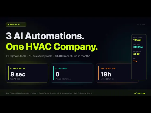 OpsFlow AI is a B2B operations automation platform built for small service businesses in the trades industry, demonstrated through a 12-person HVAC company use case. The platform replaces three high-friction manual workflows — quote generation, job intake routing, and customer follow-up — with live AI agents powered by the Anthropic Claude API. The result was 19 hours saved per week and $1,400 in recaptured billable time in month one, at a total tool cost of $180/month.