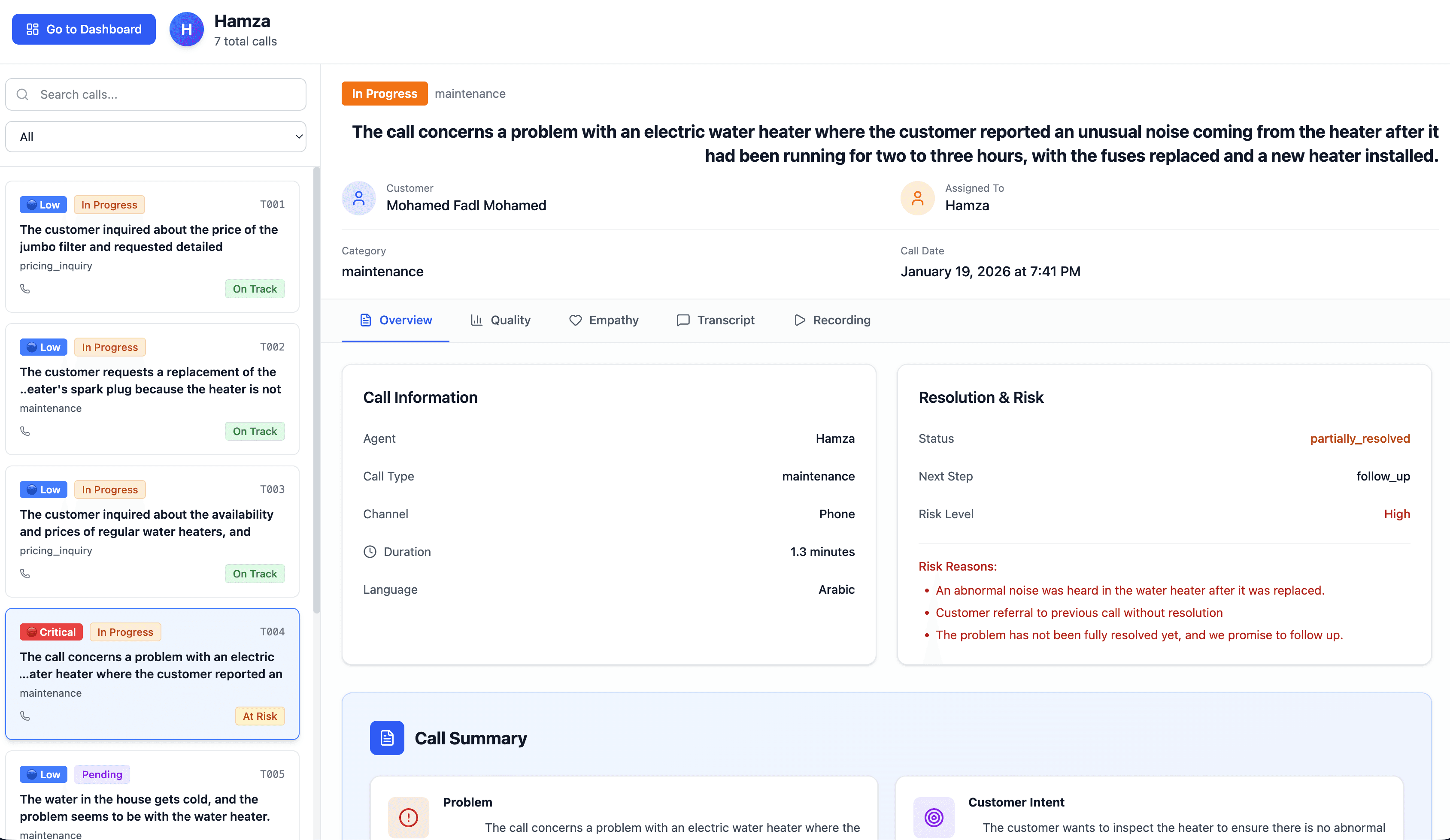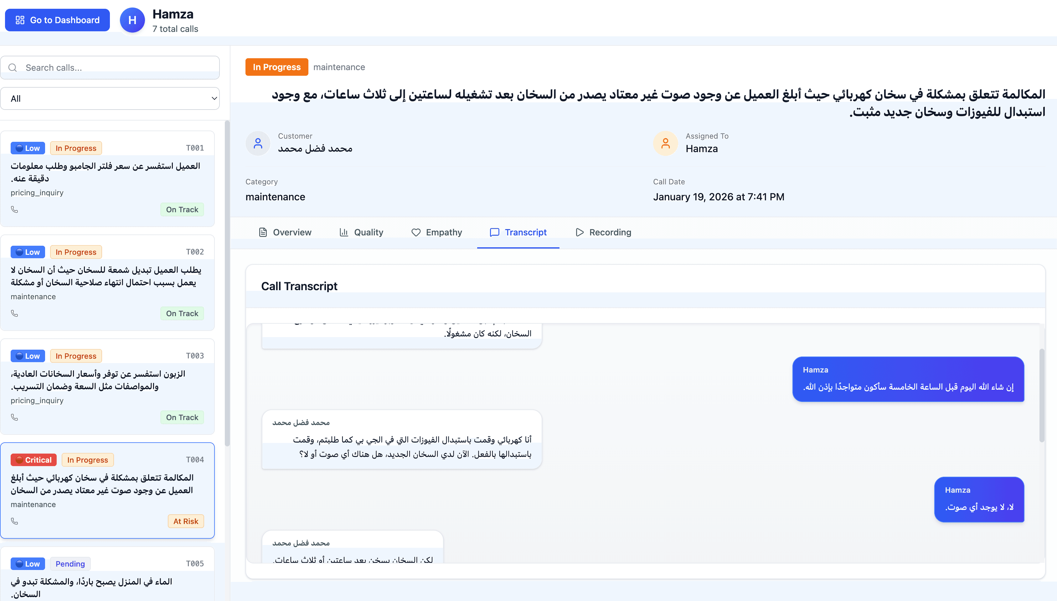 All calls are ingested automatically and transcribed in real time, supporting both Arabic and English conversations.