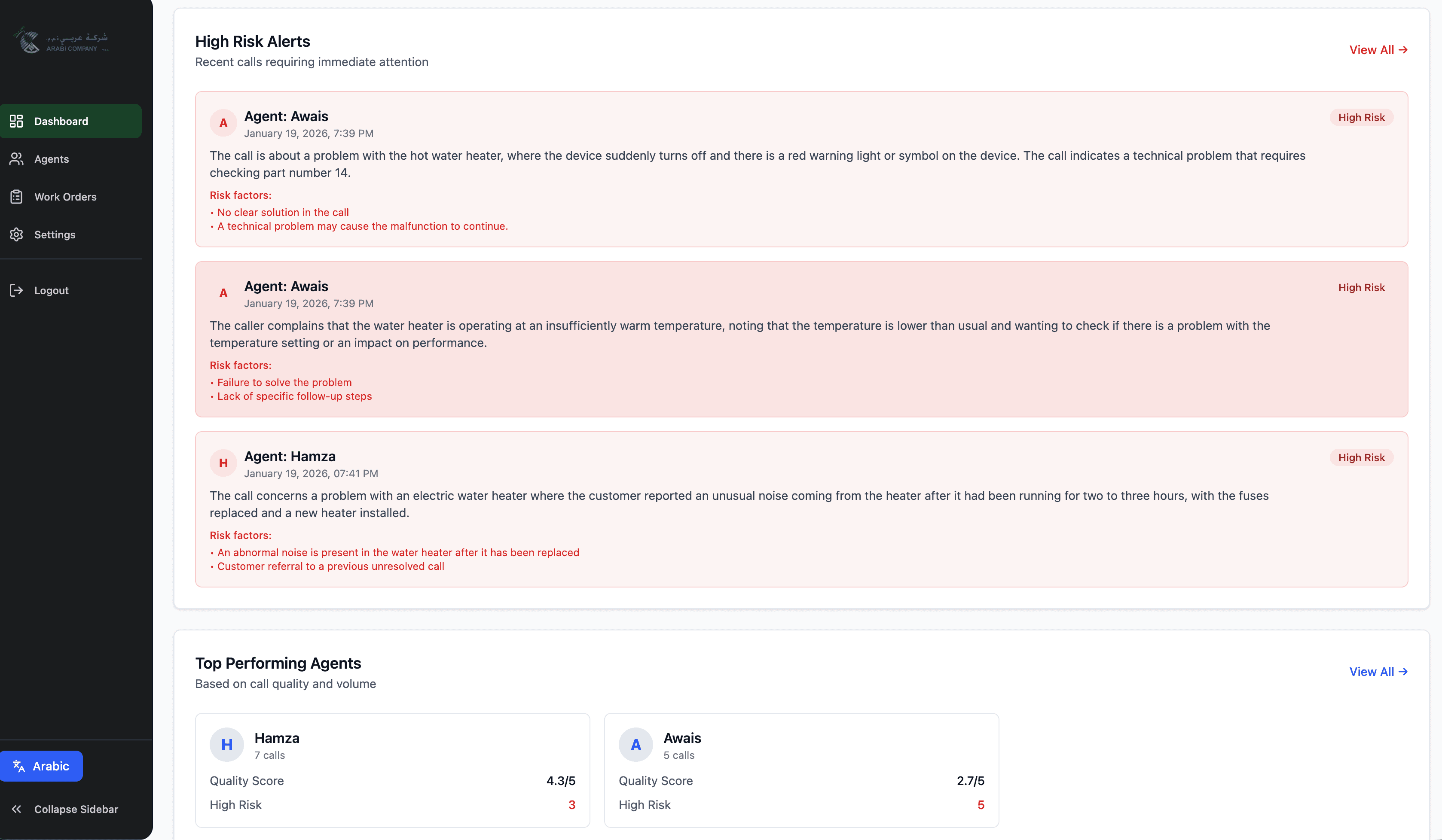 Al Arabi Company operates a high-volume call center handling over 500 service calls per day across Arabic and English. These calls cover everything from urgent maintenance issues to customer complaints and follow-ups.